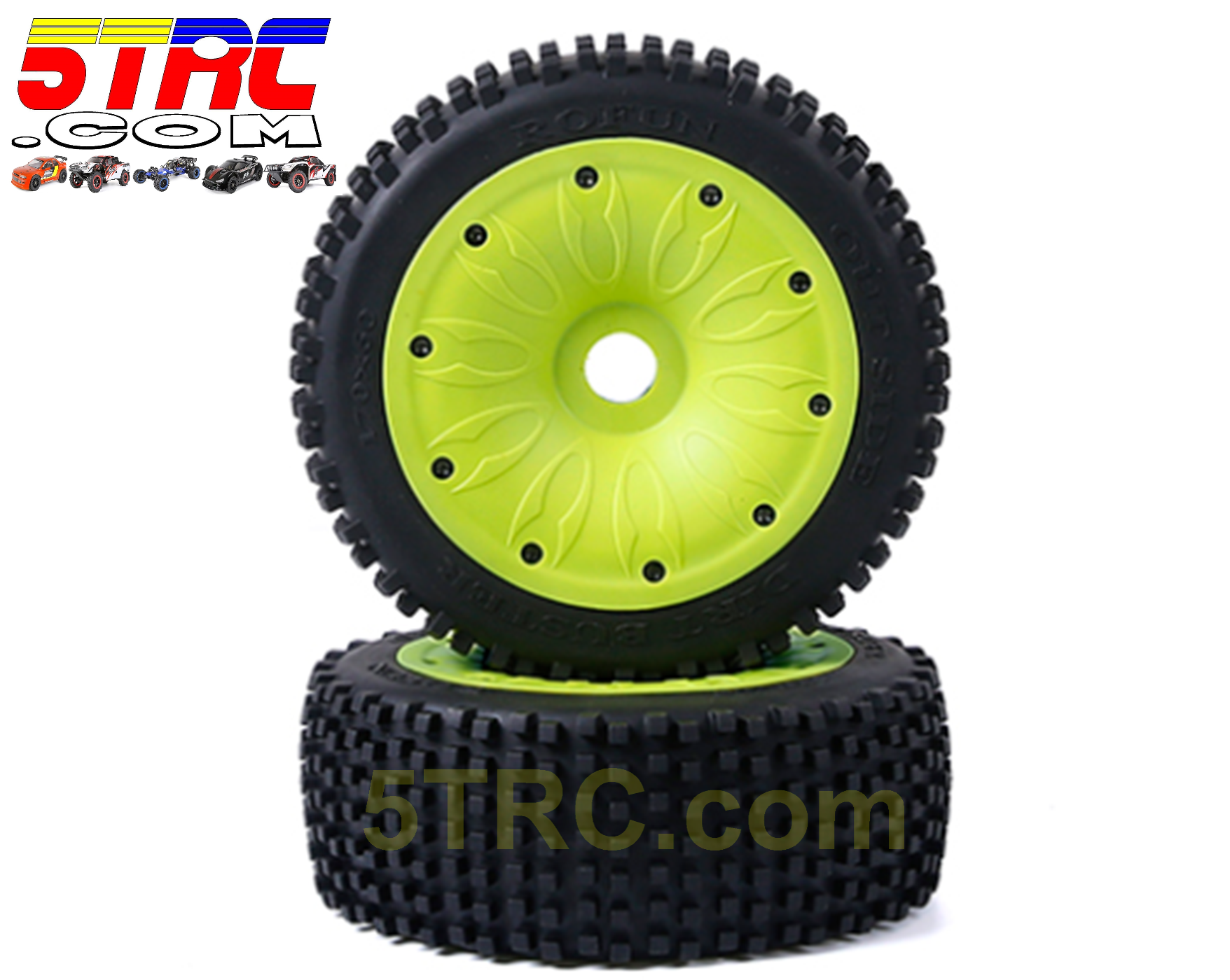 Dirt Buster Rofun Tires 170x60mm Pair of 2 on Green Dish Wheels 1/5 Scale #952962 is a mounted tire and wheel set made for fast installs and strong off-road grip. This package includes two Dirt Buster tires mounted on green dish wheels. As a result, you can swap worn tires quickly and get back on the track.